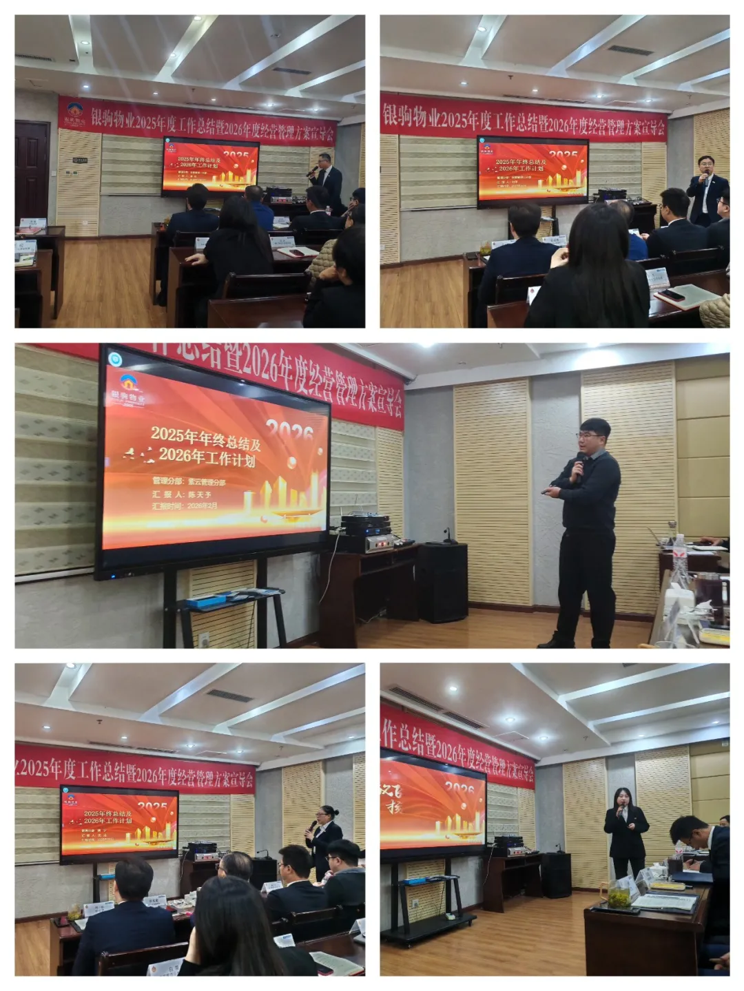 此次会议,银城集团董事长邓成勇及董事会秘书李彩霞莅临会场,参与了此次宣导会。会议伊始,银驹物业各管理分部总经理及总部各职能部门经理、总监、副总经理总结了各自团队在2025年的成绩及经验过去一年,银驹物业始终秉持服务改变生活使命,在基础服务、品质提升、安全管理等方面取得了显著成效。同时面对充满机遇与挑战的2026年,各管理人员提出了新的工作规划。